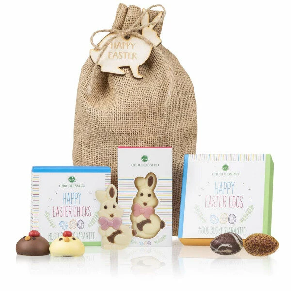 Diese feine Auswahl an Schokoladen im umweltfreundlichen Jutebeutel wurde mit einer kleinen Holzkarte in Form eines Oster-Häschen verziert, sodass es direkt verschenkt werden kann. Enthalten sind ein Osterhase aus weißer Schokolade, vier Schoko-Hühner mit Nussfüllung und vier handgeschöpfte Schoko-Eier. Machen Sie das Osterfest nicht nur fröhlicher sondern auch viel süßer.