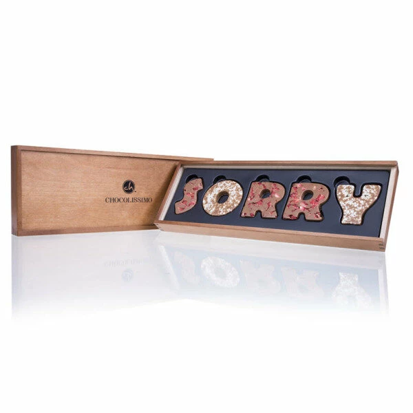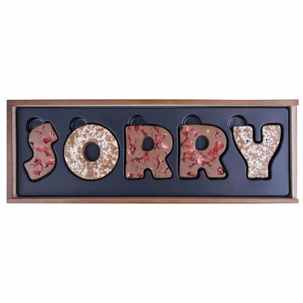 Feinste Vollmilchschokolade – geformt zu den fünf Buchstaben ‚SORRY‘ – zeigen, wie ernst Sie diese Entschuldigung meinen. Die Buchstaben ‚O‘ und ‚Y‘ werden mit feinen gerösteten Mandelsplittern und die Konsonanten ‚S‘ und ‚R‘ mit gefriergetrockneten Erdbeerstückchen verfeinert. Spätestens jetzt müsste Ihnen verziehen werden.