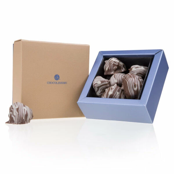 Unsere ‚Square Mini‘ enthält 100 g delikate gefriergetrocknete Erdbeeren in einem Mantel aus handgeschöpfter Vollmilchschokolade und Streifen aus Joghurt.