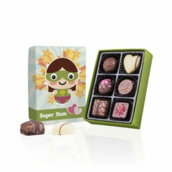 ‚Super Mom‘ – die Schachtel sagt bereits alles! Machen Sie ihrer Mutter ein Kompliment auf schokoladige Art: Sechs exquisite Pralinen mit unterschiedlichen köstlichen Füllungen, verpackt in einer lustigen Schachtel mit einem niedlichen Comic-Bild einer Superheldin und dem Aufdruck ‚Super Mom‘!