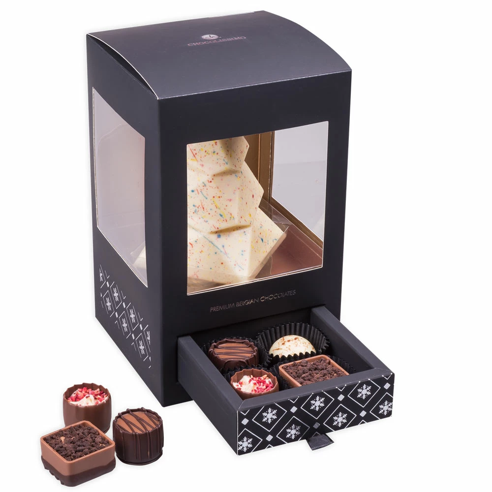 In dieser eleganten schwarzen Schachtel mit silbernen Schneefloken steckt mehr als nur ein Weihnachtsbaum! Zu einem Weihnachtsbaum aus weißer Schokolade gesellen sich 4 Pralinen, die keinen Alkohol enthalten. Die handgefertigten Pralinen verbergen sich in einem kleinen Schubfach und sorgen als süßes Weihnachtsgeschenk für eine gelungene Überraschung!