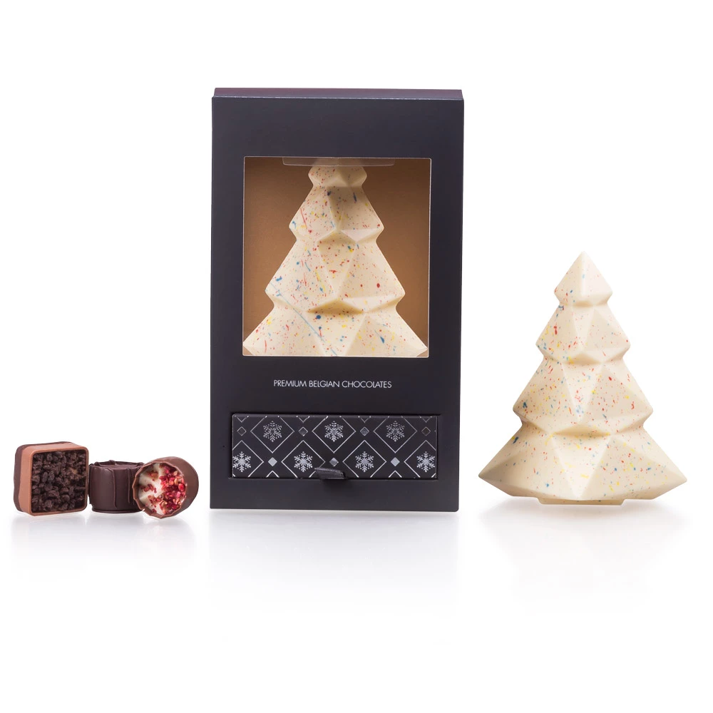 - Weihnachtsbaum aus weißer Schokolade (85 g) mit 4 leckeren Pralinen