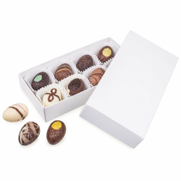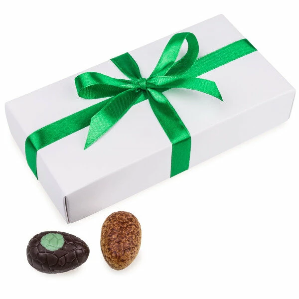 Schon bereit zum Verschenken. unsere ‚White XS With Eggs‘ bettet in einer schlichten weißen Schachtel mit frühlingshafter grüner Schleife 8 vorzügliche, österliche Schokoeier, die garantiert Jedermanns Geschmack treffen werden! Am liebsten würde man sie ja selber verspeisen, wenn man in die Pralinenschachtel blickt. Die Osterei-Pralinen mit ihren vorzüglichen Füllungen wie Mandelcreme, Nougat oder Erdbeercreme werden umschlossen von feinster weißer, Vollmilch- oder Zartbitterschokolade. Die vier schokoladigen Leckerbissen sind eine schöne Aufmerksamkeit zu Ostern für Kollegen, Familie und Freunde!