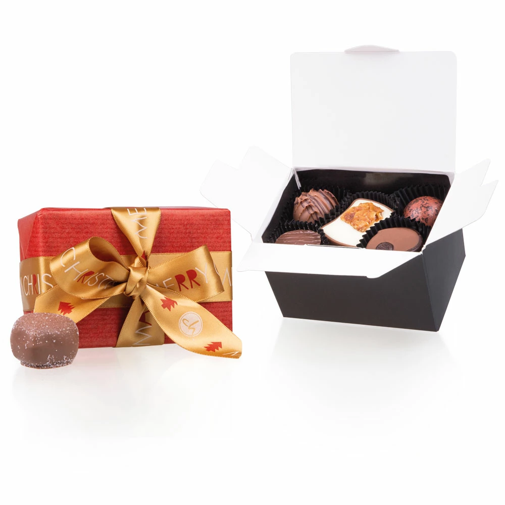 Diese 10 Pralinen sind ein wunderbares Weihnachtsgeschenk für Ihre Liebsten. Mit den unterschiedlichen Geschmacksrichtungen ist für jeden etwas dabei. Der Begriff „Ballotin“ kommt aus dem Französischen und bedeutet Geschenkverpackung, wobei sich diese Form der Verpackung als klassischer Verpackungstyp für Pralinen manifestiert hat. Traditionell werden diese Pralinen als Ballotin-Pralinen bezeichnet. Die klassische schwarze Box ist in rotem Papier und mit goldener Schleife mit dem Aufdruck „Merry Christmas“ eingepackt.