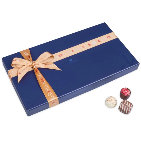 Diese Pralinenmischung zu Weihnachten kommt als edles Geschenk verpackt daher. In der dunkelblauen Schachtel, die mit einer weihnachtlichen Schleife verziert ist, finden 18 köstlich gefüllte, teils alkoholhaltige Pralinen Platz. Zweierlei schokoladenumhüllte Nüsse runden das genussvolle Weihnachtsgeschenk ab.