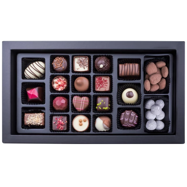Die eingelegten Pralinen sind eine Zufallsauswahl aus unserer Standard-Pralinenkollektion. Daher kann es zu Abweichungen zu den Produktbildern und zu Dopplungen der eingelegten Pralinen kommen.Da bei der Herstellung des Produktes keine Konservierungsstoffe verwendet werden, beträgt die Haltbarkeit in der Regel 6 bis 8 Wochen, maximal bis zu 3 Monate.