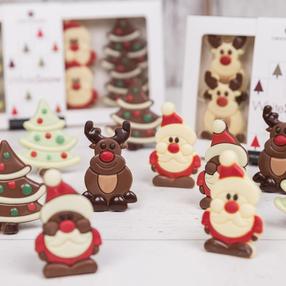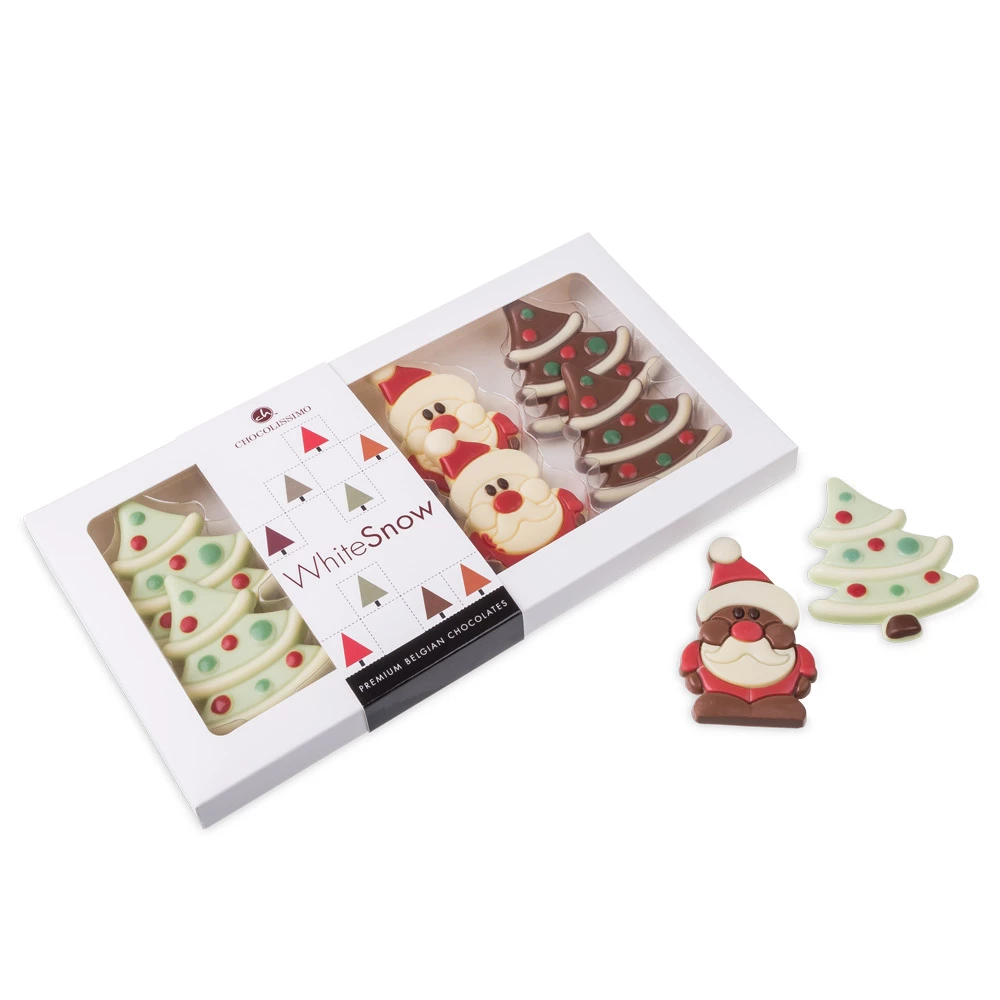 Diese Weihnachtsklassiker aus Schokolade versetzen große und kleine Naschkatzen in Weihnachtsstimmung. Die vier Weihnachtsmänner und vier Weihnachtsbäume werden aus feinster weißer, eingefärbter, Zartbitter- und Vollmilchschokolade gegossen und in eine weihnachtliche Schachtel mit Sichtfenster verpackt. Dieses süße Weihnachtsgeschenk ist nicht nur für die Augen ein Hochgenuss!
